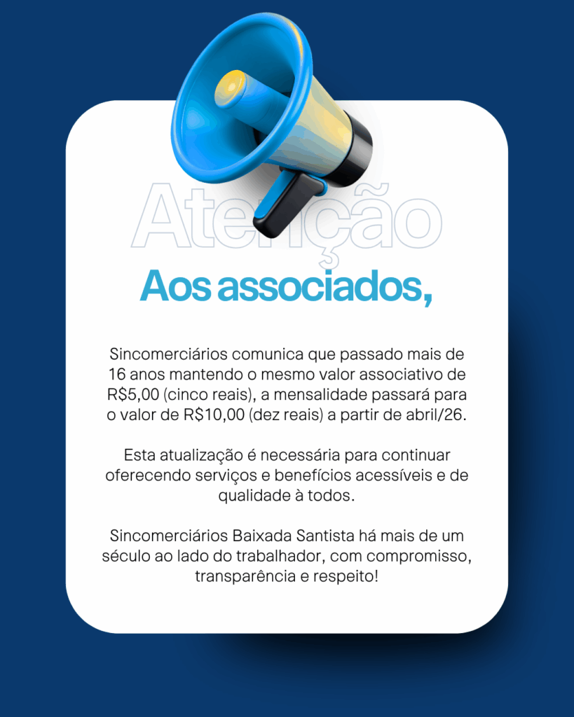 Aos associados, Sincomerciários comunica que passado mais de 16 anos mantendo o mesmo valor associativo de R$5,00 (cinco reais), a mensalidade passará para o valor de R$10,00 (dez reais) a partir de abril/26.